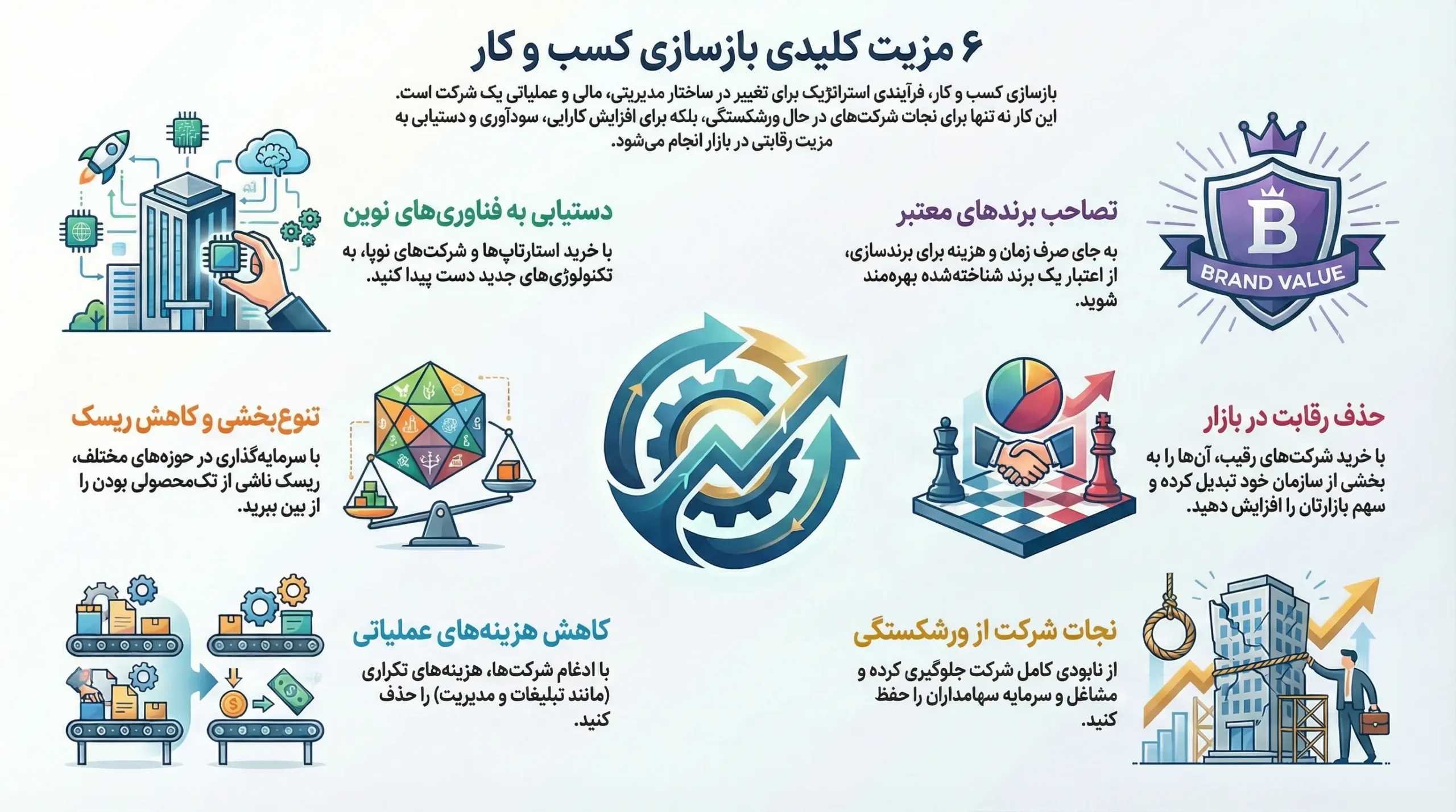 ادغام با یک شرکت دیگر میتواند به کسبوکار فرصت تنفس برای بازسازی کسب و کار را بدهد. همچنین مسیری به سوی فرصتهای جدید و حذف واحدها و محصولات تجاری منسوخ شده به منظور افزایش کارایی شرکت را فراهم می کند.